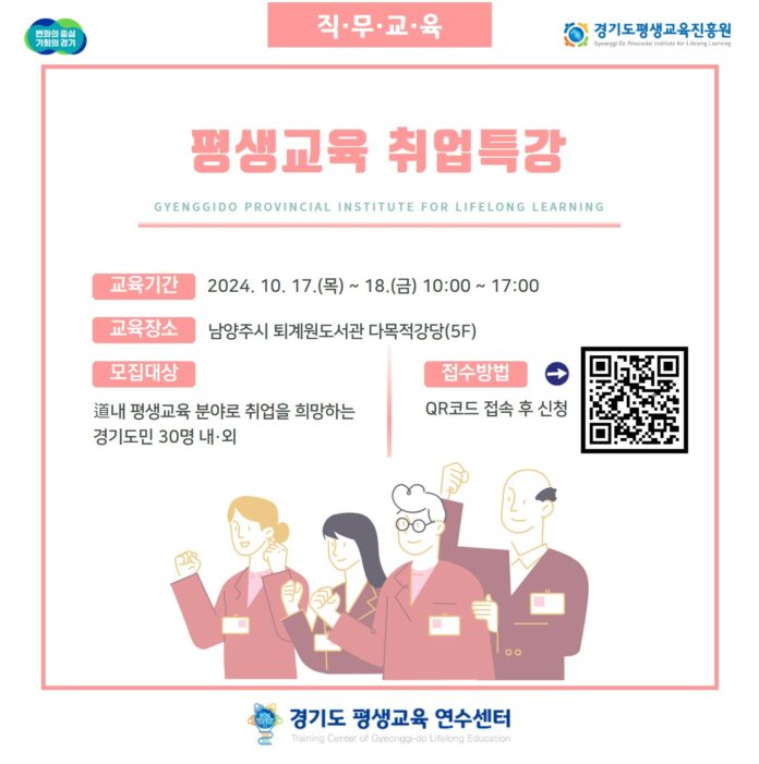 경기도평생교육진흥원은 평생교육 일자리 지원을 위해 ‘평생교육 취업특강’을 개최하고 9월 11일부터 10월 10일까지 참여자 30명을 모집한다고 밝혔다.