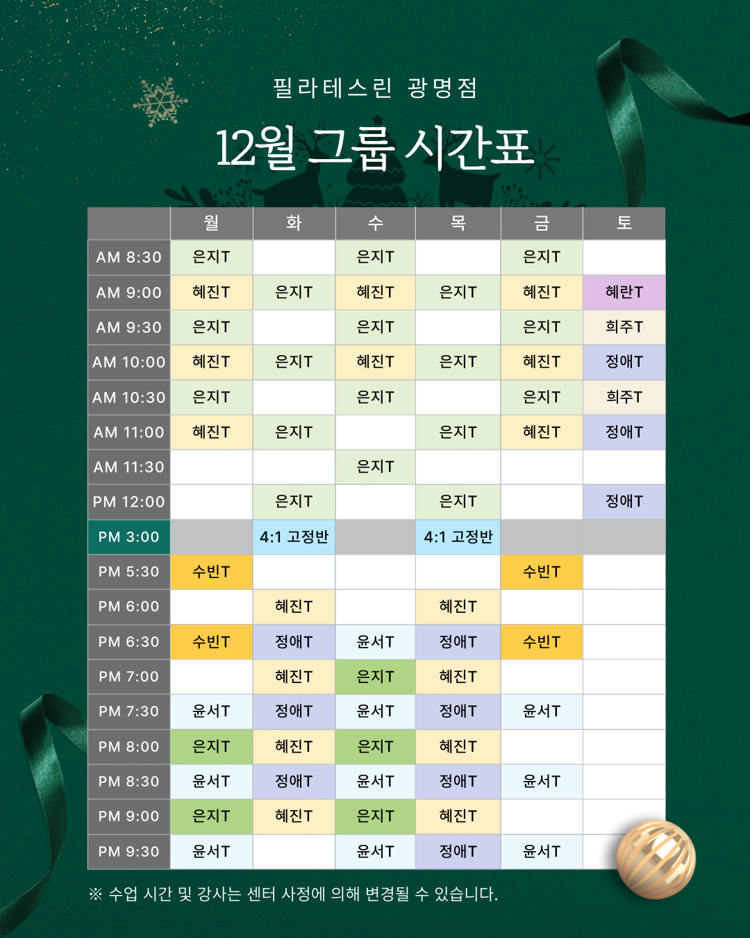 필라테스 광명점이 12월 그룹레슨 시간표를 공개하고 신규 회원 모집을 진행한다.