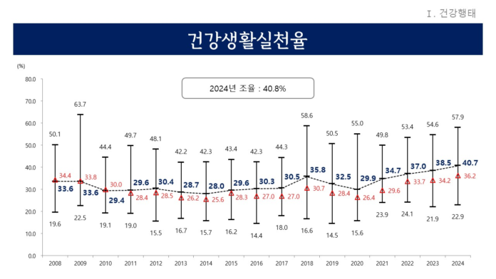 금연, 절주, 걷기 모두를 실천한 복합지표인 ‘건강생활실천율’이 전국 중앙값 36.2%보다 4.5% 높은 40.7%로 나타났다. 이는 지역사회건강조사를 실시한 2008년 이후 역대 최고치다. 시군별로는 과천시 57.9%, 성남시 분당구 56.5%, 용인시 수지구 54.7% 순으로 높은 수치를 나타냈다.