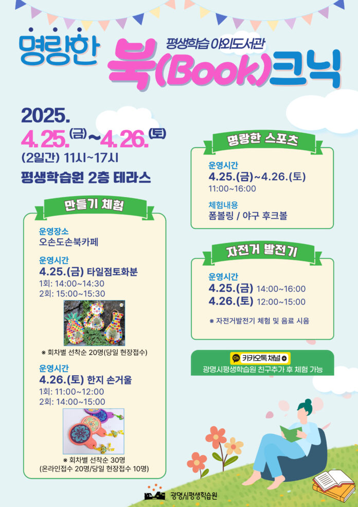 광명시 평생학습원은 오는 25일부터 26일까지 이틀간 평생학습원 2층 테라스와 오손도손 북카페 등에서 2025년 상반기 평생학습 야외도서관 ‘명랑한 북(Book)크닉’을 운영한다.