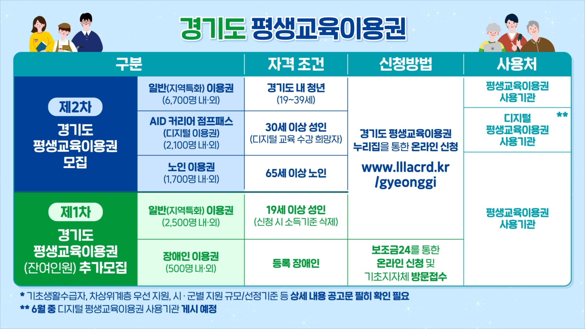 일반·청년·디지털·노인이용권은 경기도 평생교육이용권 누리집(lllcard.kr/gyeonggi)에서, 장애인이용권은 보조금24 누리집(www.gov.kr)에서 신청할 수 있다.