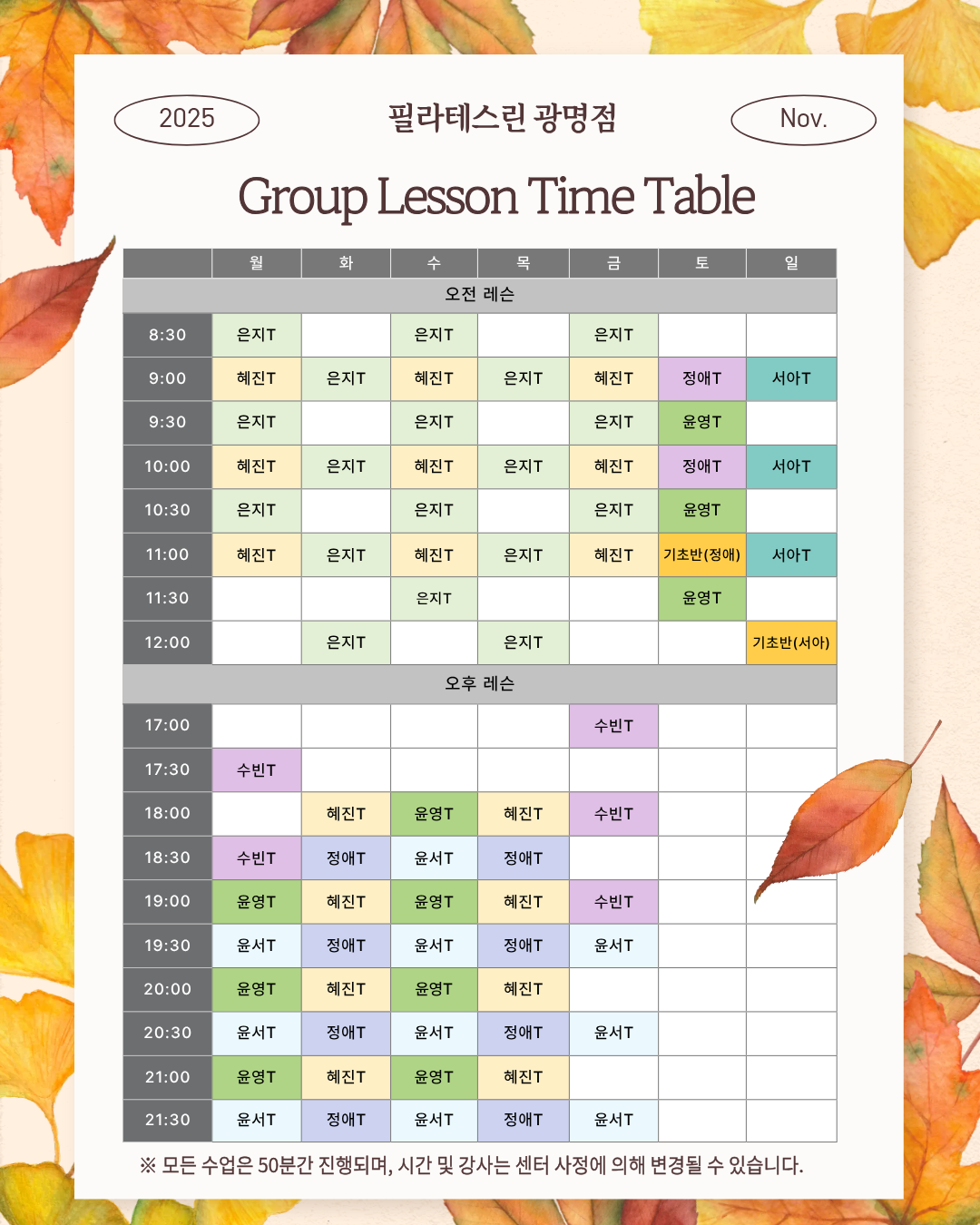 필라테스린 광명점은 본격적인 겨울철을 대비해 운동으로 면연력을 높이고자 하는 지역민의 수요를 반영해 그룹레슨을 확대한 11월 그룹 시간표를 공개했다고 31일 밝혔다.