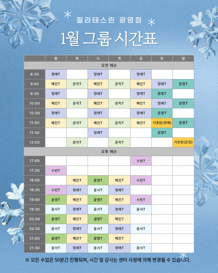 센터는 새해와 겨울방학 시즌을 맞아 운동 수요가 늘어날 것으로 예상됨에 따라 평일 오전 8시 30분부터 오후 9시 30분까지 일 평균 13회의 그룹레슨을 제공한다. 주말인 토요일과 일요일에는 오전 9시부터 낮 12시까지 총 10건의 수업이 진행된다. 필라테스린 광명점은 1월에도 일주일 간 총 75건, 광명 최다 규모 그룹 수업을 진행해 회원들의 새해 운동 결심 실천을 적극 도울 예정이다.