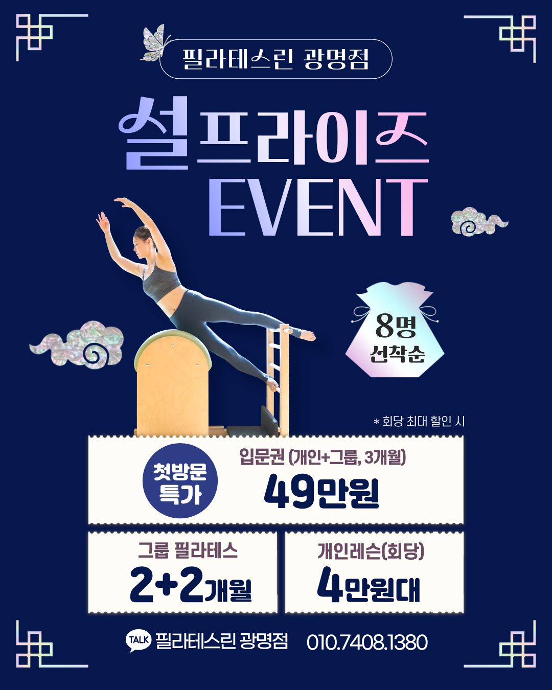 이번 설맞이 이벤트는 선착순 한정 인원으로 진행되어 선착순 마감 시 조기 종료된다. 모든 상담은 사전 예약으로 진행되며, 이벤트와 수강권에 대한 자세한 문의는 필라테스린 광명점 유선 및 온라인을 통해 가능하다.