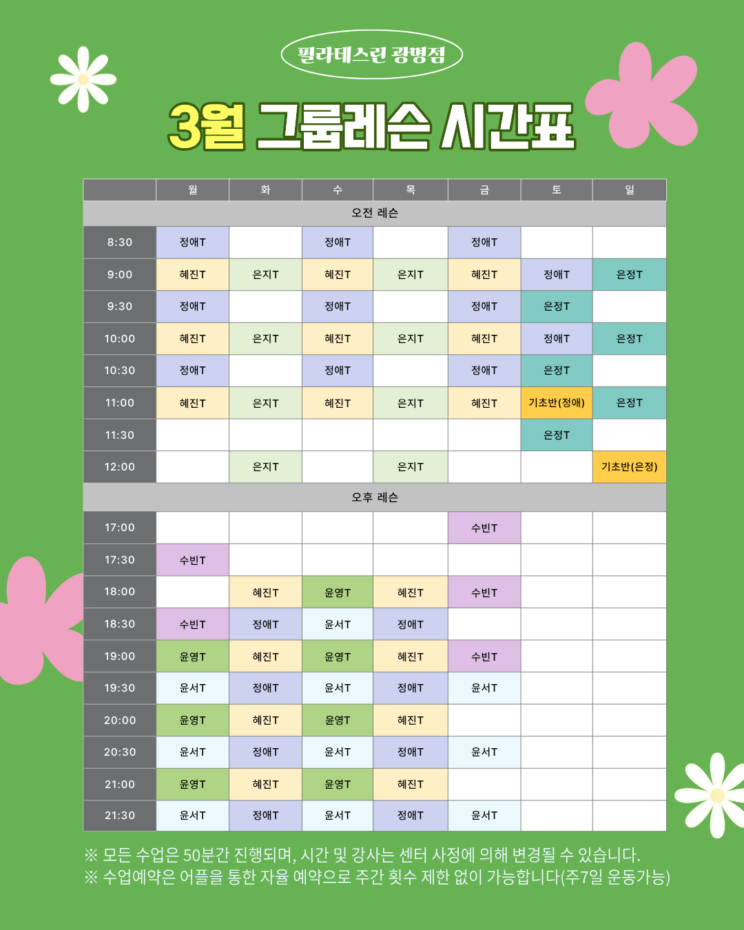 필라테스린 광명점이 운동 수요가 늘어나는 봄을 맞아 주 7회 레슨 가능한 3월 그룹레슨 시간표를 공개했다.