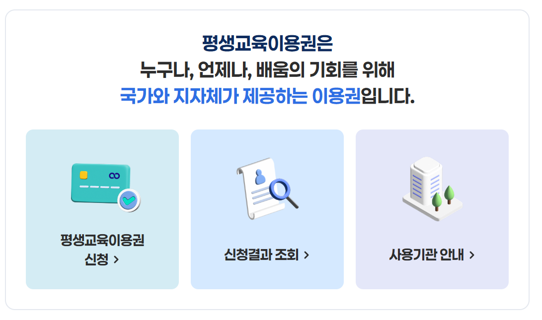 ‘평생교육이용권’은 평생교육 강좌 수강료와 교재비에 사용할 수 있도록 1인당 35만 원의 지원금(카드 포인트)을 지급하는 사업이다.