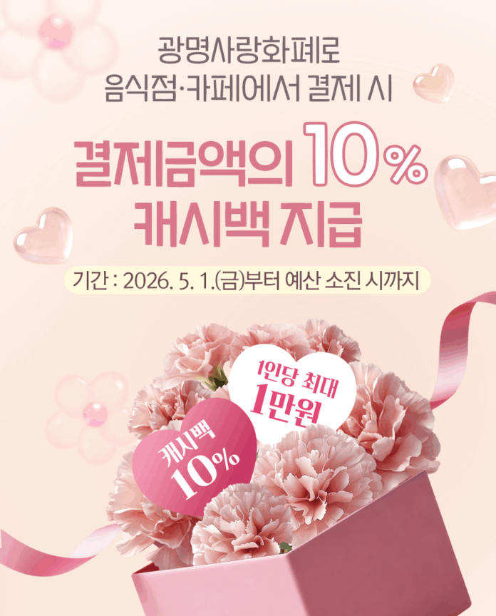 시는 오는 5월 1일부터 5월 한 달간 광명사랑화폐 가맹점 중 음식점·카페에서 광명사랑화폐로 결제하는 경우 결제 금액의 10%를 환급하는 ‘가족 외식비 캐시백 지원사업’을 추진한다.